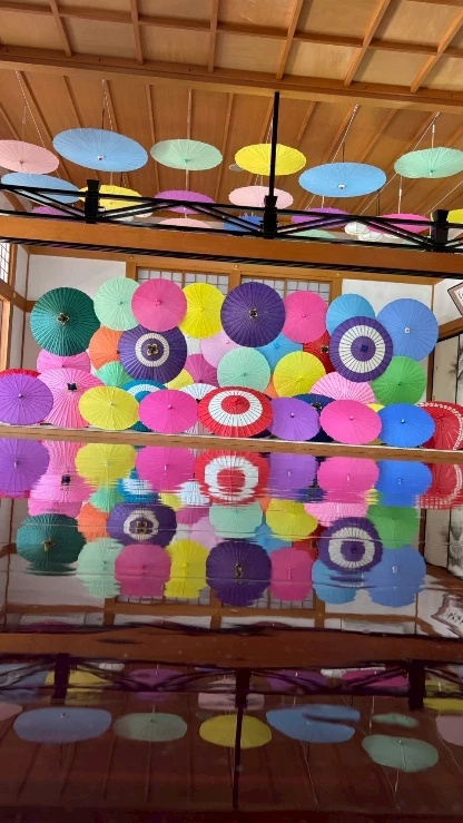 また、アンブレラスカイと呼ばれるカラフルな傘を空につるしている道もあって光が差し込むととってもきれいでした! 本堂に上がると和傘が重なるようにして並べられており、逆さ富士のように下の床も反射することで視界いっぱいに美しさが飛び込んできました。住職の方にお話を伺うと「福がかさねがさね」来るようにと傘が重ねて並べられているとのことでなるほど〜〜と思いました。