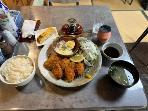 衣はサクッ、噛むと牡蠣の旨みがじゅわっと来るタイプ。「今日はちゃんとごほうびが欲しい」日におすすめ。大盛り無料を使うと、満足度がさらに跳ね上がります。