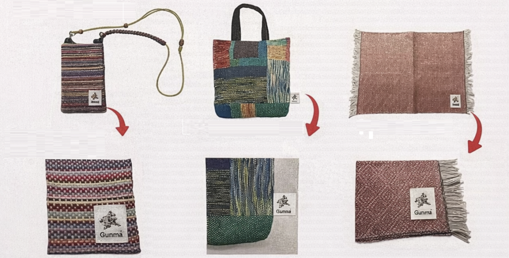 導入される布タグは、製品のデザインに合わせて使い分けられるよう、製品に縫い付ける布タグ(縦4㌢×横3㌢)とタグを半分に折って製品に縫い込む(縦2㌢×横6㌢)の2種類を用意。ロゴとともに「Gunma」の文字が刻まれ、スマホポーチやパッチワークトートといった製品に直接取り付けられる。