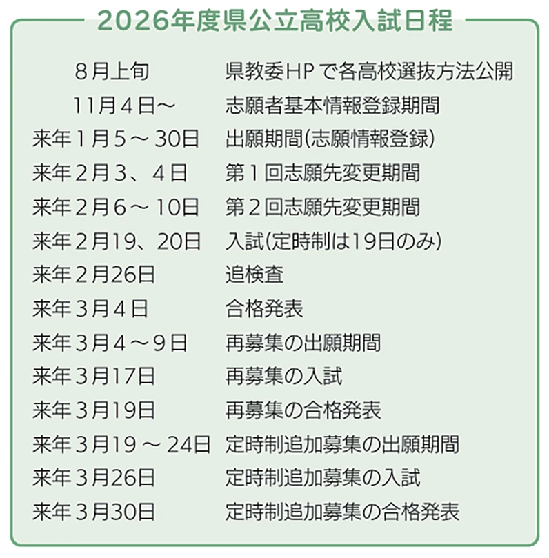 まず最初に押さえてほしいのは、入試は「来年2月19、20日の一発勝負」(定時制は19日のみ、再募集、追加募集は別日程)ということです。
