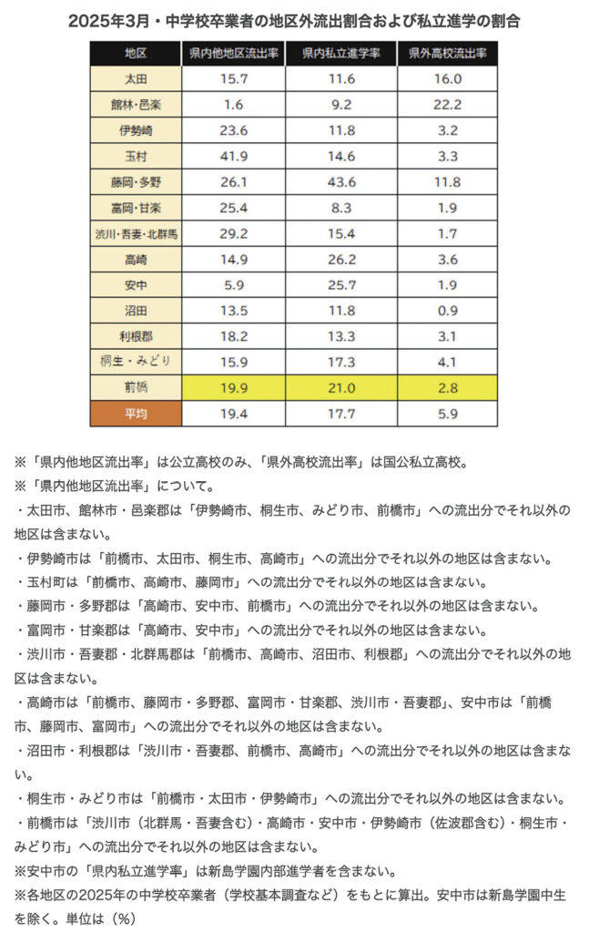 2025年3月の中学校卒業者の進学先を見ると、県内他地区の公立高校については、前橋市内への流入が730人、流出が574人で「流入超過」となっている。桐生市方面へは流出が上回っている。