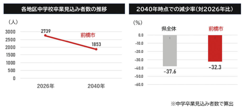 生徒数の減少傾向を見ると、前橋地区は2040年時点で2026年に比べて32・3%減と、他地区に比べて緩やかな減少となっている=グラフ。