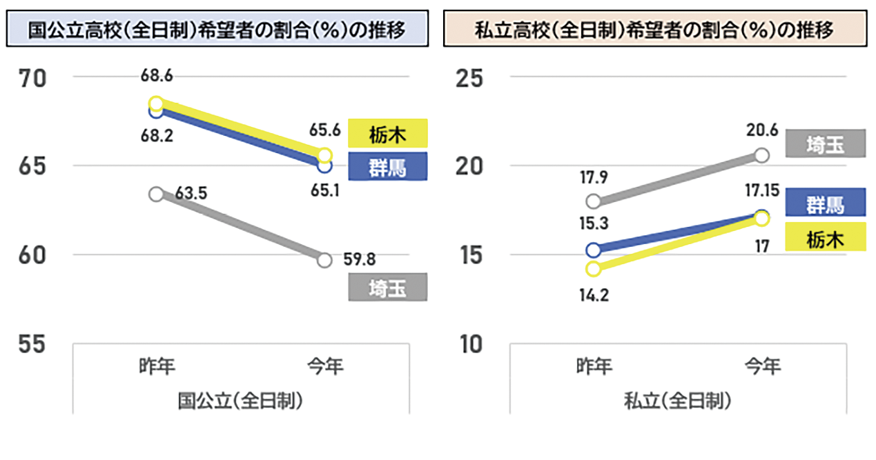 まず注目されたのが、私立高校への進学希望者の増加、いわゆる「公立離れ」の影響である。ある学校関係者からは、「群馬は私立高校への流出が特に多かったのではないか」という声も上がった。しかし、3県を横並びで比較すると、この見方は必ずしも数字に裏付けられていない。