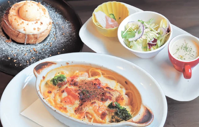 ランチでもディナーでもお得に楽しめる人気の早得サービス。アンティパスト、スープ、サラダの前菜プレート・パスタやピザなどから選べるメイン1品・手作りスウィーツ等から1品・ドリンクバー。これで1,538円!!写真は人気のオリジナルパスタ『エビのうま味たっぷりビスクのグラタン風スパゲッティー』。『エビのうま味が驚くほど詰まった石焼き十穀米リゾット』も人気。