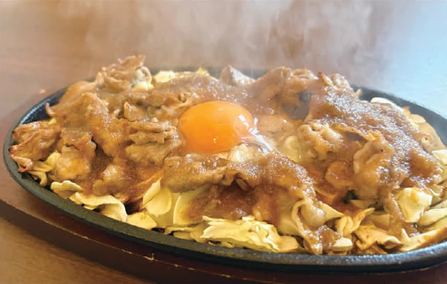写真は熱々の鉄板の上にキャベツと国産豚肩ロースの薄切りをのせ上から特製オニオンソースをかけた食欲そそるおすすめメニューの「じゅうじゅう焼き(1,200円)」+卵トッピングです。また、焦がしバターの香りにトマトの酸味を加えてガーリックを少し効かせた冬季限定「カキのムニエル焦がしバターとトマトケッパーソース」、新メニューの「牛ヒレカツ」なども人気です!