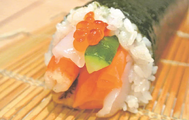 福を巻き込むように1本1本心を込めた、寿司職人手作りの恵方巻(太さ5cm、長さ21cm)。煮穴子、海老、サーモン、いくら、きゅうりの海鮮恵方巻(1本1,944円)=写真。煮穴子、玉子、きゅうり、かんぴょう、椎茸のこだわり恵方巻(1本1,080円)。ずわいがに、数の子、海老、いくら、玉子、きゅうりの超豪華巻(1本2,700円)の3種。アレルギーや苦手なネタ、お好みのカットなど、オーダーメードにも対応。「何なりとお申付ください」。受取は2月1・2・3日に各店で。