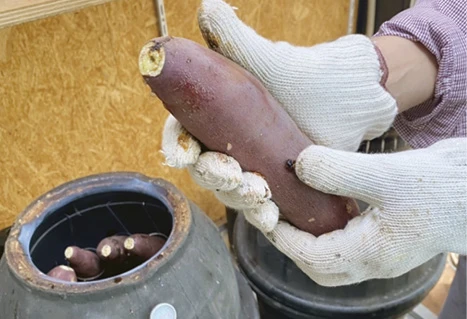 つぼ焼き芋は備長炭に火を入れてから窯が温まるまで1時間以上、そこから炭が落ち着いて温度も一定になって芋を入れてから2時間。じっくり、ゆっくり焼くのが特長です。じっくり火を通すことで、芋本来のうま味や甘みを引き出します。