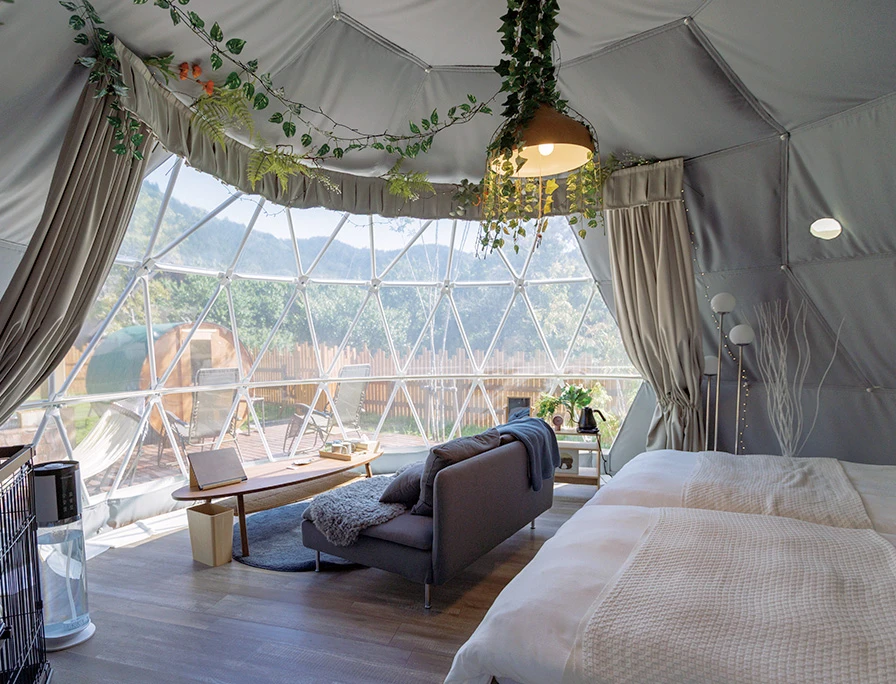 全7棟のドーム型テントは、それぞれのテーマに沿ったステキなしつらえが。うち3棟は愛犬と泊まれるドッグドームで、室内から続くプライベートガーデンも用意されています。
