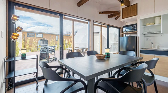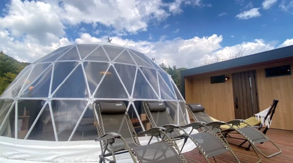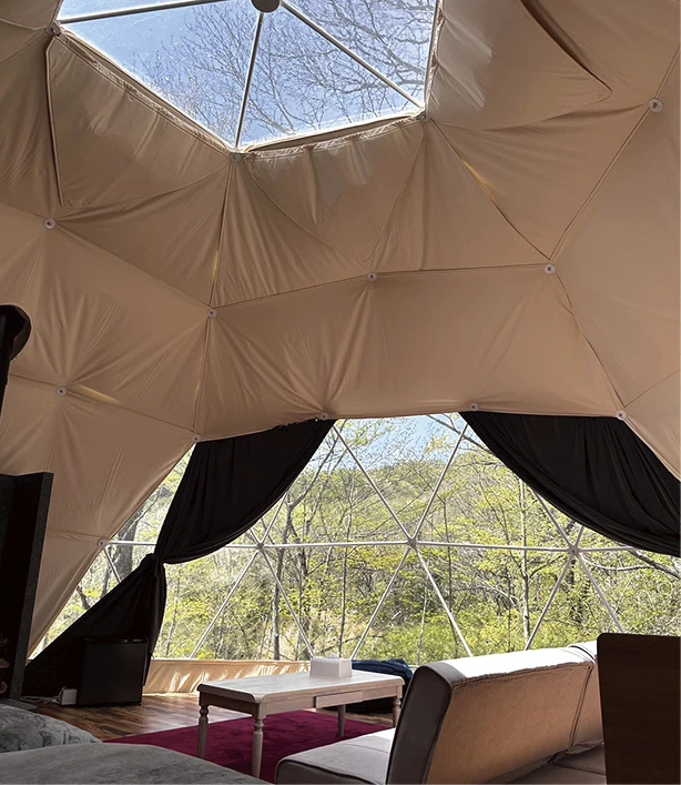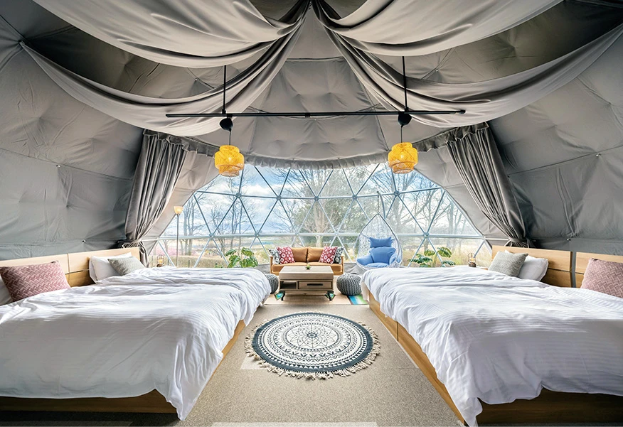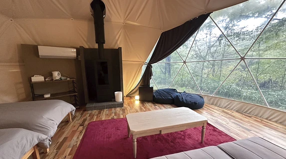 キャンプ場内の一番奥、少し小高くなった場所には2棟のグランピング施設。ドーム型の居住空間にはシングルベッド3台とダブルベッド、ソファベッドが1台ずつあり、6人まで快適に泊まれる空間が広がります。テント内から目前の大自然を見渡せるほか、夜には天窓から星空を眺めることもできますよ。
