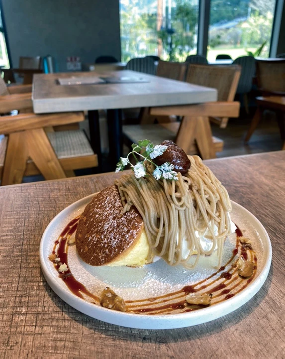 写真の「和栗モンブランパンケーキ」(1280円)はシカモアカフェの秋のイチオシメニュー。チェックイン前、チェックイン後に、ゆったりカフェで過ごすのもおすすめです♪