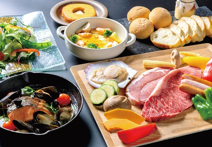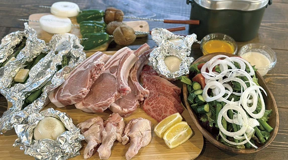 夕食は「上州麦豚」をメインに、地産野菜やフルーツなどを楽しむBBQほか11月からすき焼きメニューがスタート! 朝食はホットサンド、フルーツ、ヨーグルトなど。素泊まりにして道の駅売店、あいのやまの湯レストランを利用する人もいるそう。持ち込みBBQも可能です(要グリルレンタル代)。