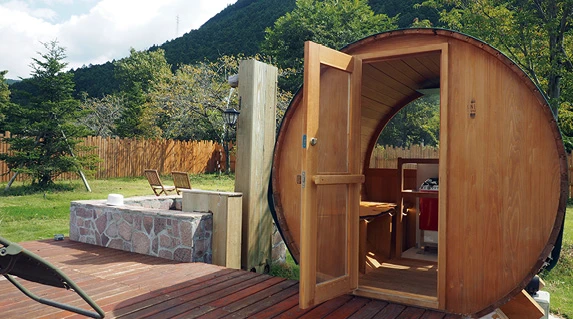 森の中を切り取ったような、囲われたプライベート空間には広い芝生もあり、わんちゃんを自由に走らせることも。お部屋の目の前にあるプライベートサウナでロウリュウを楽しんだ後は、地下からくみ上げた軟らかい水のぜいたくな水風呂に漬かれます。