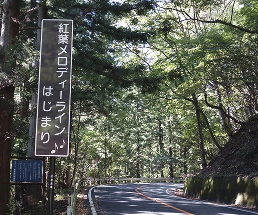 期待に胸を膨らませ、いざ碓氷峠へ。峠の上り口にある玉屋ドライブインを過ぎ、碓氷湖を左手にかすめると、ほどなく「この先メロディーライン 40㌔で走行すると『紅葉』~もみじ~が流れます」の看板が。続いてすぐ「メロディーライン♪はじまり」の看板が現れ、いよいよ走りぞめスタートです。走行音が高めなオールシーズンタイヤなのではっきり聞こえるか、ちょっと不安でしたが、確かに紅葉のメロディーが耳に入ってきました。でも、いままでに走ったところよりは若干控えめです。