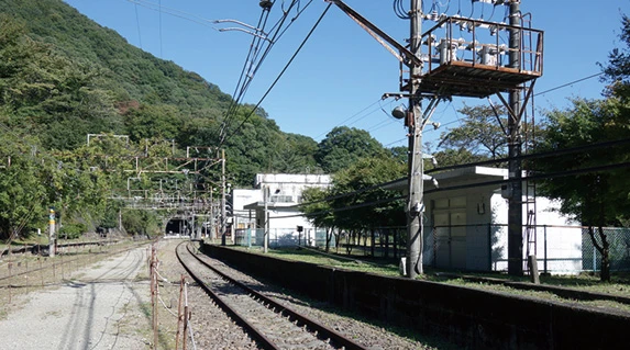 階段を上りきると、急に視界が開け、線路や変電所が目に入ります。構内には、アプト式開通の碑とともに、1950年6月の崩落事故で亡くなった国鉄職員など関係者を弔う殉難碑もありました。後述する玉屋ドライブインのおかみさん・小池節子さんによると、今でも災害が起きた6月には国鉄OBの方が慰霊に見えるそうです。