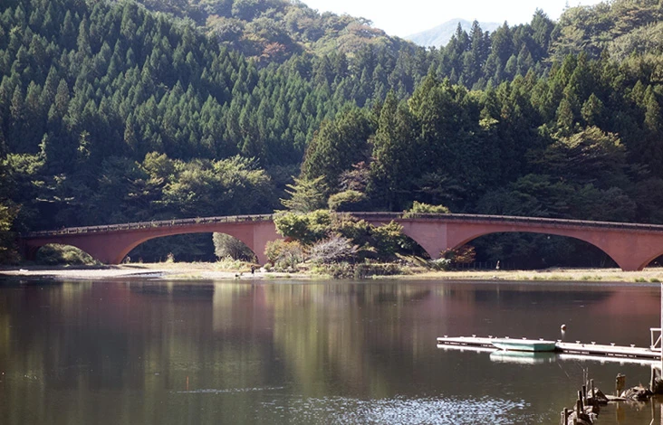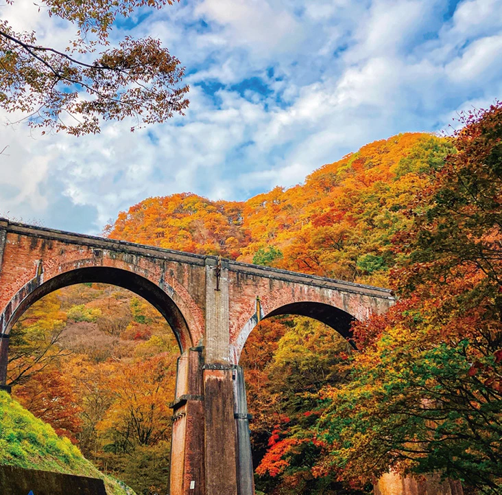碓氷湖にある坂本ダムは、堤高36・3㍍、堤体長85㍍の重力式コンクリートダム。湖畔には約1・2㌔の散策道が整備され、約20分で一周できます。ダムの洪水吐に架かる橋梁は鉄道トラス橋、湖面には国の指定重要文化財である旧国鉄信越線の碓氷第三橋梁(通称めがね橋)をイメージしたレンガ張りのアーチ橋が2橋架かっています。 湖面に映るアーチ橋と紅葉、一見の価値あり、です。