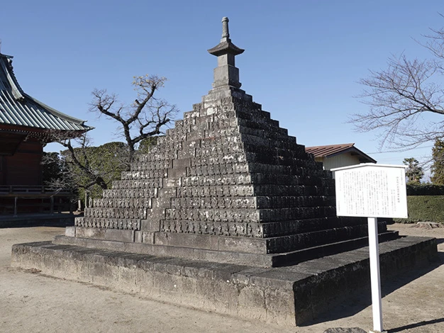 境内にはひときわ目を引く石造千体不動塔も。その名の通り千体の不動尊像が刻まれた高さ6㍍のピラミッド形。寺院隣にあるPYRAMID CAFÉ & ROASTERY(ピラミッドカフェ&ロースタリー)の名の由来になっています。
