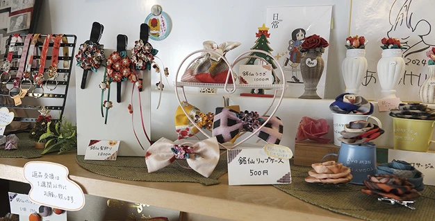 2階には機織り機や型紙なども展示しており、1階ショップでは銘仙生地を再利用したかわいい小物を販売しています。