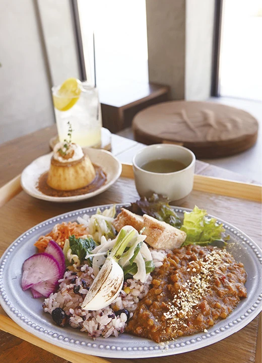 もっと気軽にお寺に来てほしいと、明王院副住職の島田さんがバリスタの青木さんと営むカフェ。僧侶を務めながら調理師学校で学び、念願のカフェをオープンした島田さんこだわりの「季節の精進風キーマカレー」(スープ・ドリンク付き1580円)と手作りデザート、自家焙煎(ばいせん)コーヒー、バリスタによるクラフトドリンクなどがいただけます。