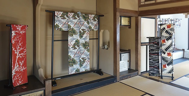 季節ごとに替わる伊勢崎銘仙を展示しているのも魅力の一つ。1月は新春の彩りを感じる銘仙が、和洋折衷の間を華やかに演出しています。
