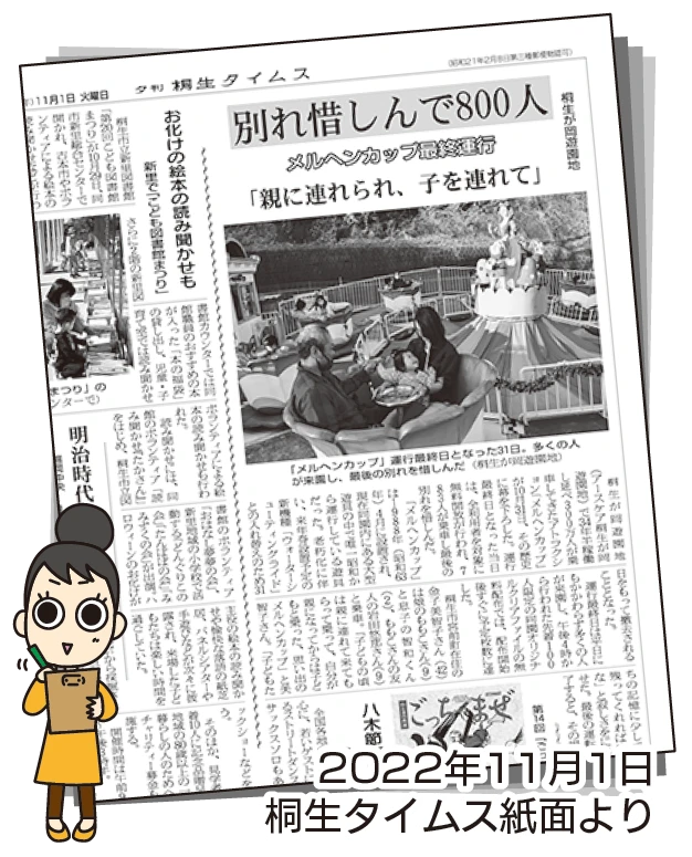 2022(令和4)年11月1日の紙面をめくると、「別れ惜しんで800人」という見出しが目に留まりました。桐生が岡遊園地で34年間にわたり親しまれてきた回転遊具「メルヘンカップ」が、10月31日、ついに最終運行を迎えたという記事でした。