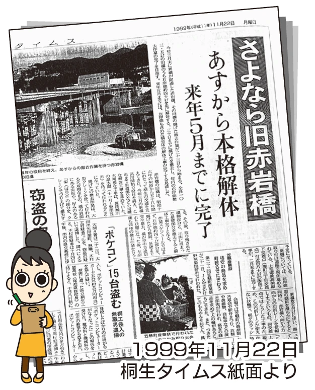 1999年11月22日の紙面をめくると、「さよなら旧赤岩橋 あすから本格解体」という見出しと、旧赤岩橋の写真が目に留まりました。昭和16年の架設以来、58年間にわたって桐生の交通を支えてきた橋。その橋げた撤去が、ついに始まるという記事でした。