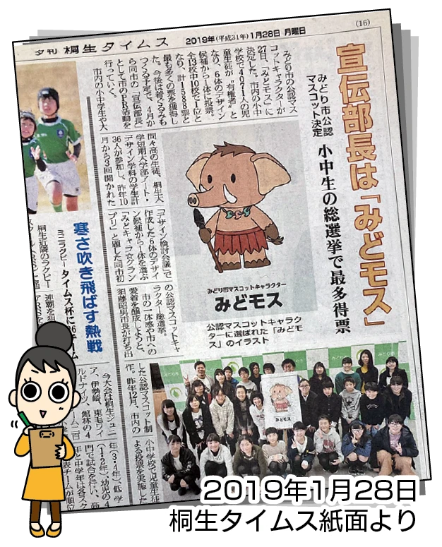 2019年1月28日の紙面をめくると、「宣伝部長は『みどモス』」という見出しが目に留まります。愛らしいキャラクターのイラストと、学生たちに囲まれた写真。そこには、みどり市の公認マスコットキャラクター誕生の様子が紹介されていました。