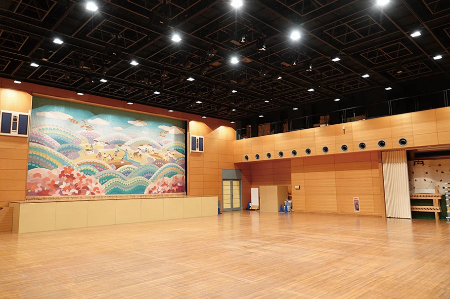 ぐんまこどもの国児童会館の多目的ホール。広々としたフラットな状態から、観覧席を並べた劇場へと早変わりもできるんです♪