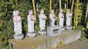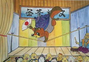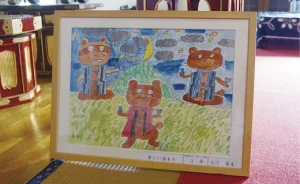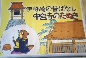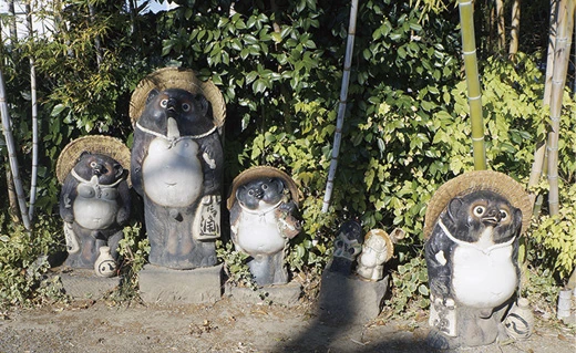 駐車場に車を止めるとまず目に入るのが、愛嬌(あいきょう)たっぷりのたぬきの置物たちです。昔、たぬきがお寺にすみ着いていたずらをしたため、館林の茂林寺へ行かせたという昔話も伝わっています。境内には紙芝居や、それを見た児童たちの絵もたくさん飾られています。