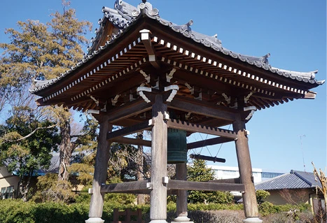 参道入り口付近の駐車場に車を止めて進むと山門があり、正面に本堂、右手に鐘楼堂があります。梵鐘(ぼんしょう)は、江戸時代5代将軍・徳川綱吉が開創した廣済寺にあったものと伝えられ、同寺が廃寺となった後、宝林寺に掛けられました。太平洋戦争時、多くの寺院の梵鐘は供出されましたが、この梵鐘は徳川綱吉の名が刻まれていたためその難を逃れ、現在、千代田町指定重要文化財となっています。